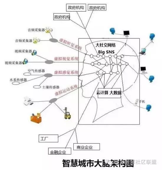 这个大社交网络与智慧城市紧密的结合是智慧城市能否建设成功的关键,也就是说智慧城市的每个要素,无论是居民、企业、政府机构、路灯、车辆、工场,都要以城市神经元的方式加入到智慧城市的大社交网络网络,这些城市神经元的互动、聚合、链接将成为城市变成智慧城市的关键点。城市中枢神经系统(云计算建设)、城市感觉神经系统(物联网建设)、城市运动神经系统(工业4.0建设)、城市智慧的产生与应用(大数据与人工智能建设)的产生而是以此为基础才能真正运转起来。