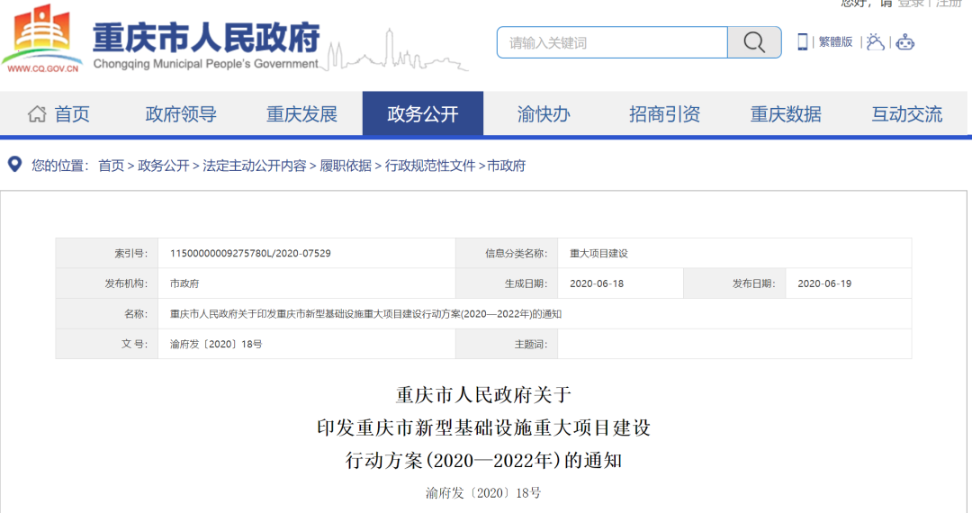 6月18日,重庆市政府发布《重庆市新型基础设施重大项目建设行动方案(2020—2022年)》(下称《方案》)。3年里,重庆市将总投资3983亿元,滚动实施和储备375个新基建重大项目。